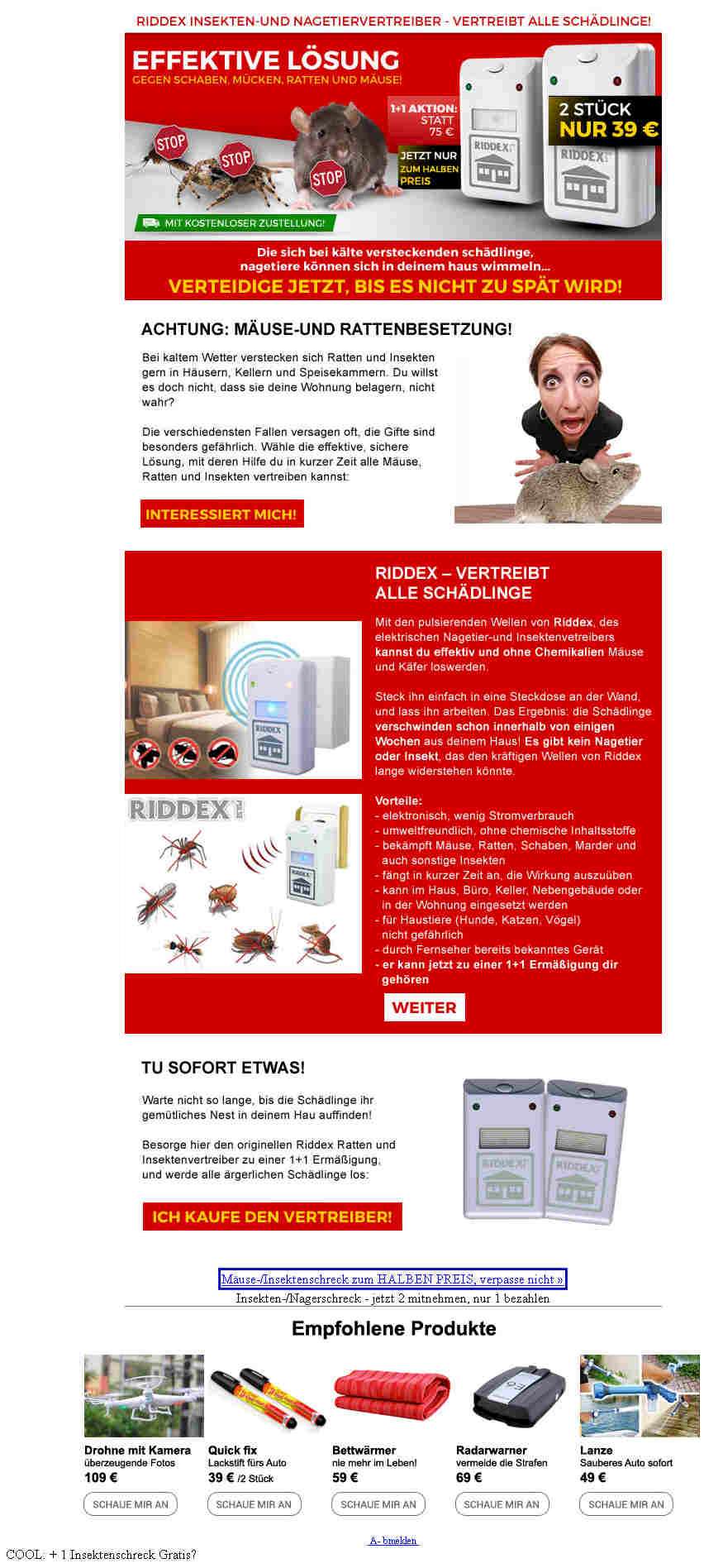 Der "Riddex Insekten- und Nagetiervertreiber vertreibt alle Schädlinge" wird darin behauptet, 2 Geräte für nur 39 Euro (statt vorher 75 Euro) werden angeboten. Ganz unten sogar "Cool: + 1 Insektenschreck Gratis?"