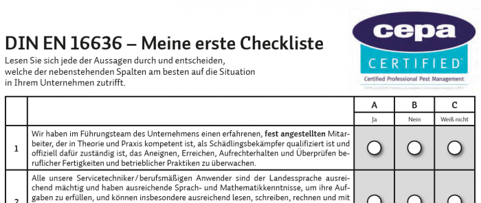 Ebenfalls neu: Es gibt jetzt erstmals ein brancheneigenes Zertifikat für Schädlingsbekämpfungsbetriebe. Die CEPA hat das ermöglicht. Das Audit des ersten Bewerberbetriebes steht in Kürze schon an. Wenn alles klappt, ist dieser Betrieb dann der allererste "CEPA-Certified"-Betrieb in Deutschland.