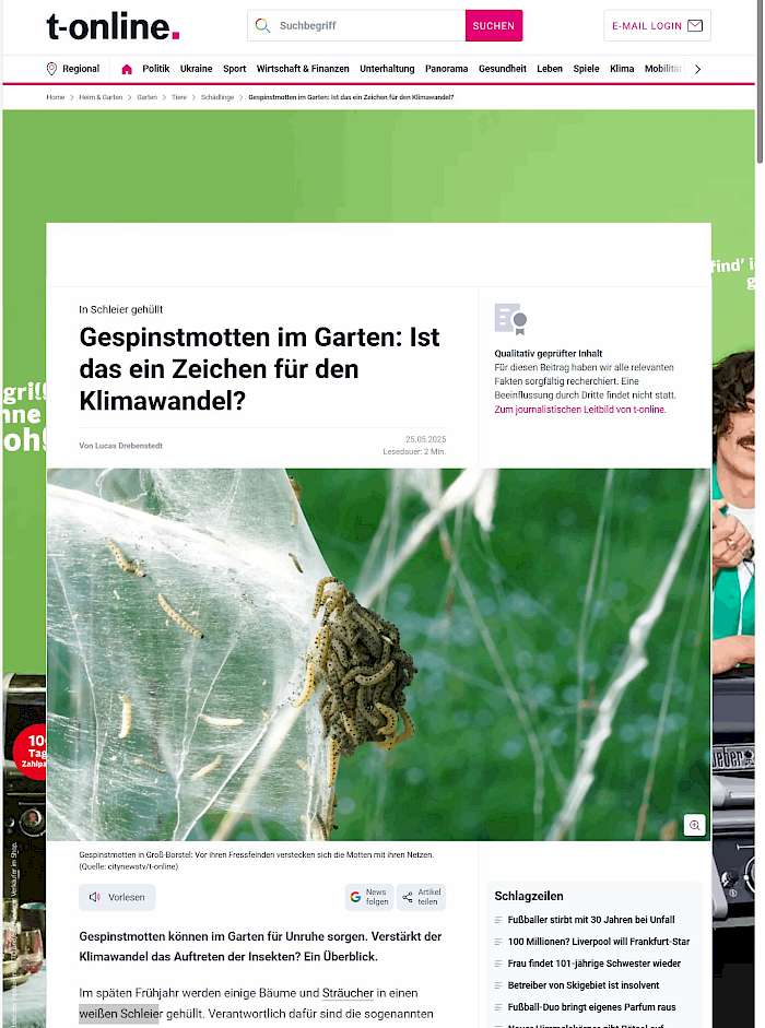 t-online.de erklärt, dass von einem weißen Schleier umhüllte Bäume und Sträucher im Frühjahr von Gespinstmotten betroffen sind, die dann beginnen, die betroffenen Gewächse "aufzufressen". Laut NABU verstärkt der Klimawandel die Intensität des Befalls. Bekämpfungstipps gibt es auch.