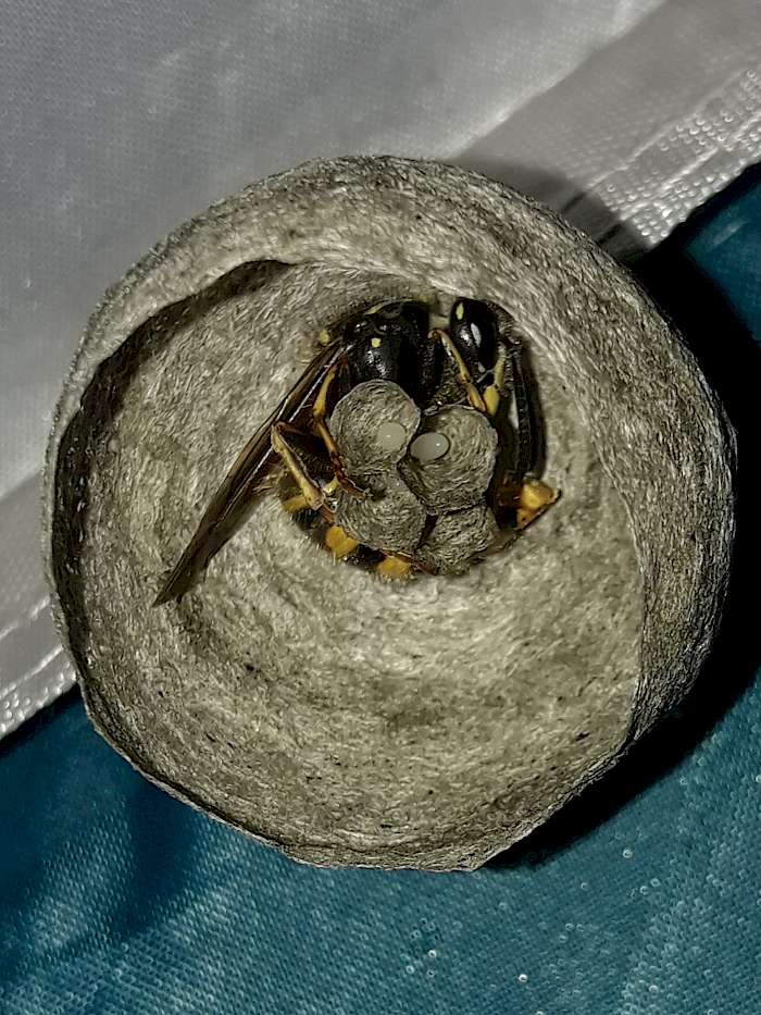 Vor 2 Wochen beim Campen entdeckte eine meiner Töchter eine Wespenkönigin, welche sich gerade an der Innenseite meiner Zeltwand zu schaffen machte. Es war schnell klar, was sie da tut: Ein Nest bauen! Welch Glück! Natürlich waren wir uns alle einig, dass sie erstmal dableiben darf und wir regelmäßig die Fortschritte mit der Kamera dokumentieren. Dabei entstand dieses geniale Foto einer Jungkönigin, welche sich des Nachts schützend und wärmend um die ersten Waben legt, welche auch schon drei Eier beinhalten. Leider schlug der Umsiedlungsversuch zu uns nach Hause fehl. Königin und Waben haben wir vorsichtig in eine ausgepolsterte Brotdose verfrachtet und mitgenommen. Wir haben das Nest Zuhause zwischen den Doppelfenstern angeklebt und den Zugang nach außen für 36 Stunden unterbunden mit Zugabe von Zuckerwasser. Die Königin krabbelte zwar herum, interessierte sich aber nicht mehr für ihr Nest. Ich öffnete am nächsten Tag das Außenfenster und dann war sie leider weg. Das war ihr wohl nicht der geeignete Nistplatz. Sehr schade. Das Foto wurde mit einem Samsung Galaxy Xcover geschossen, dessen Linse mit einem gleichmäßigen Wassertropfen präpariert wurde, um eine bessere Aufnahme zu erzielen.